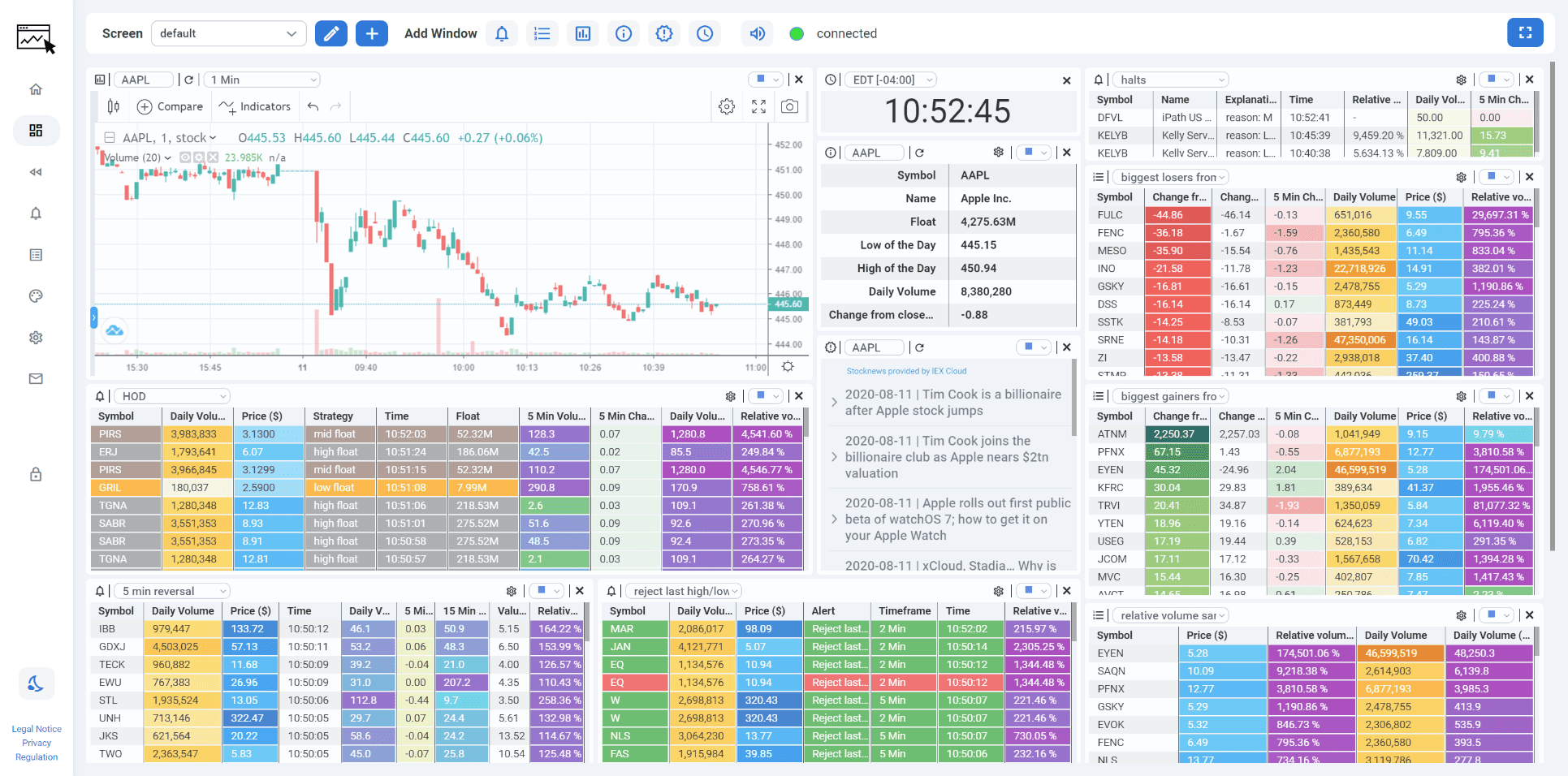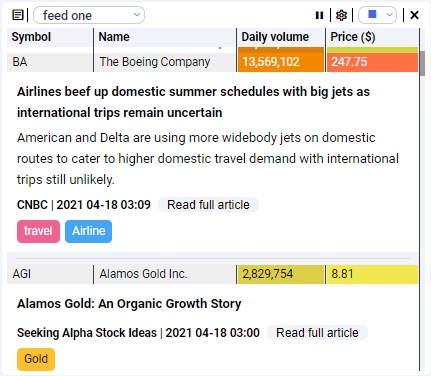 The newsfeed tile displays published news from all major stock market sources and is updated in real-time. Attached to the news are customizable keywords and data columns of the stocks related to the article. Filters and the displayed columns are fully customizable.