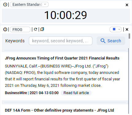 With the clock tile, you can see the current time in a choosen timezone. The stock news tile provides the latests news for a choosen symbol. Futhermore, it is possible to filter the articles by one or multiples keywords.